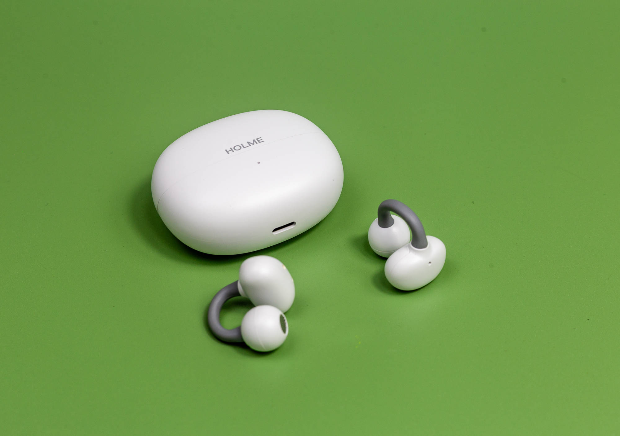 虹觅 Air2耳夹式蓝牙耳机的充电盒,哑光白色,扁圆形,没有棱角,重约32g,便于携带,安全性也比较好。因其小巧光滑,平时也可以当一个小巧的把玩件。充电盒正中可以看到HOLME的灰色LOGO,其下是一个很小的白色指示灯。底部有一个TypeC的USB充电口。充电盒电池容量250mAgh,大概可以为耳机**大约3次左右的续航,使耳机的整体续航能力达到8+24小时,可满足一天的使用需求。