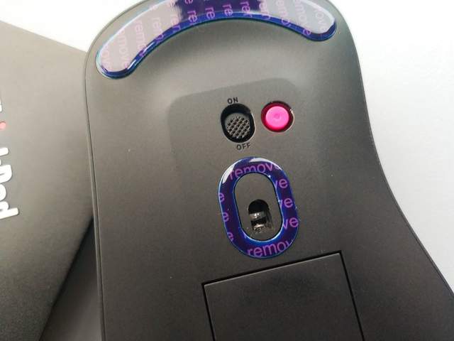 首先看中央的位置,这里设计了鼠标开关,还有一个粉色的按键。这个粉色按键可以自定义,其出厂默认的功能是回报率切换。