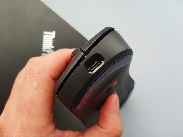 鼠标还可支持无线、有线两种模式的连接。前部下方设计有一个Type-C接口,用于有线连接使用。内置800毫安时锂电,至高无线连续使用约200小时续航。