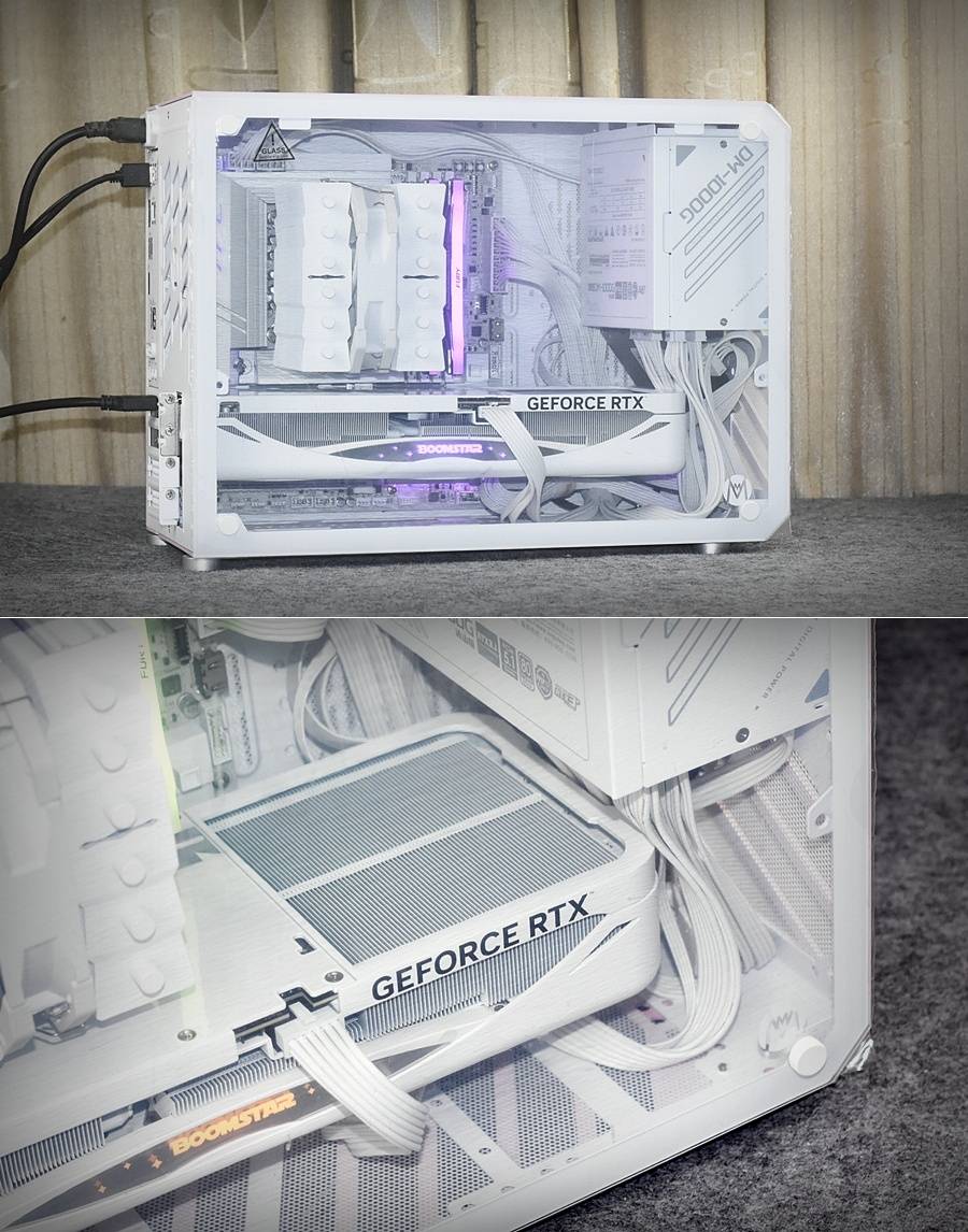 这里使用了机械大师CMAX机箱,进行上机演示。 影驰RTX 5070 星曜LUNA OC长345mm,能够轻松安装在机箱内。透过实拍,显卡尾部距离机箱前面板依然留有一定余量,考虑到我使用的是MATX主板,所以兼容性完全不是问题。 机械大师CMAX:体积 20.5L;颜色 活力黄、典雅黑、极地白、月光银、樱花粉;尺寸 392*185*284mm;尺寸(含脚垫、提手等外凸料件) 392*185*338mm;材质 内框:1mmSPCC钢材 ;外框:2mm铝合金;前置接口 USB3.0*1+Type-C*1;重量 净重:4.2KG/毛重:5.2KG;主板支持 MATX/ITX;电源支持 SFX/SFX-L/(140mm以内)ATX;散热支持 162mm风冷/240水冷;显卡支持 385*160mm以内;风扇支持 顶部:12cm*2;尾部:12cm*1;前面板:8/9cm*1;2.5寸硬盘位 至多3个;3.5寸硬盘位 至多1个; 机械大师CMAX机箱显卡支持4卡槽厚度,40系及50系旗舰显卡也能轻松兼容,而影驰RTX 5070 星曜LUNA OC的厚度仅有2.5卡槽,所以兼容性毫无问题。 点亮后的BOOMSTAR信仰光标识,真的很星曜! Y1S1,裸卡颜值及灯效比装在机箱里要好看得多。 散热马甲中段部分及顶部BOOMSTAR标识灯效。讲真中段的光效部分让人联想到自家HOF的设计元素,这样的搭配真的略显意外,但是毫无违和感,甚至非常和谐。 尾部BOOMSTAR星星标识,赋予光芒后,熠熠生辉此刻具象化。