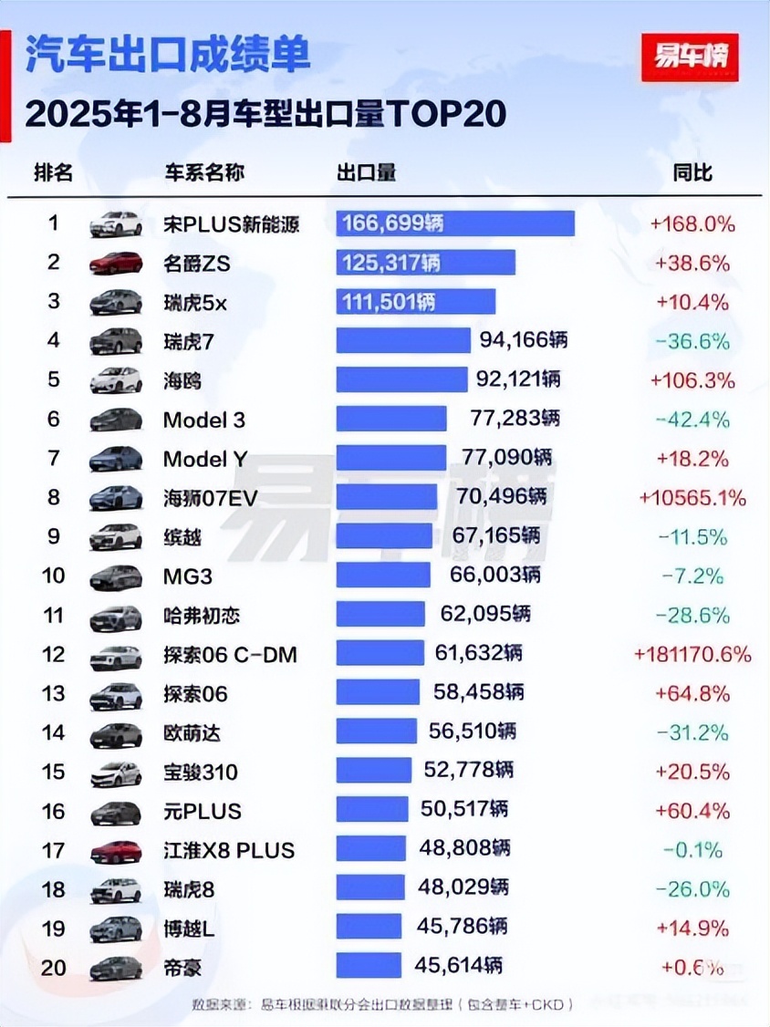 1-8月车型出口排行榜,比亚迪宋Plus新能源独占鳌头
