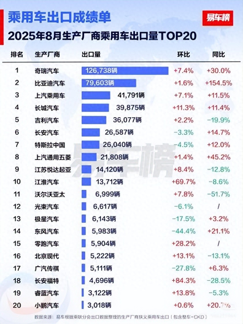 比亚迪出海再秀亮眼成绩,根据权威汽车媒体易车整理的出口数据:8月,比亚迪在生产厂商乘用车出口量排名中以79603辆的成绩位列第二,同比增长154.5%,增速排名第一。今年1-8月,比亚迪汽车累计出口量达601065辆,其中明星车型宋PLUS新能源销量达166699辆,摘得车型出口榜冠军。  8月生产厂商乘用车出口量,比亚迪排名第二,同比增速第一