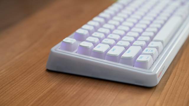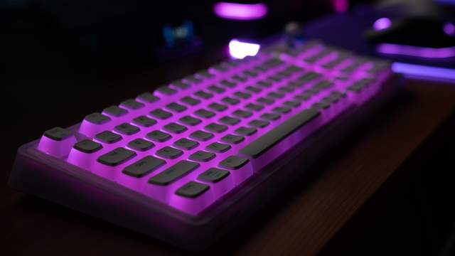 至于灯效,我觉得有惊喜也有遗憾,惊喜的是,这个雾面的布丁键帽呈现的灯效实在惊艳,在灯光的照射下,一颗颗键帽犹如美玉,细腻柔和温润。