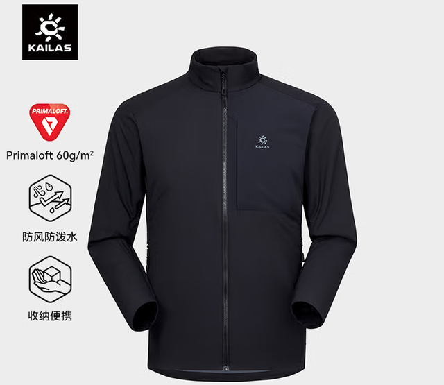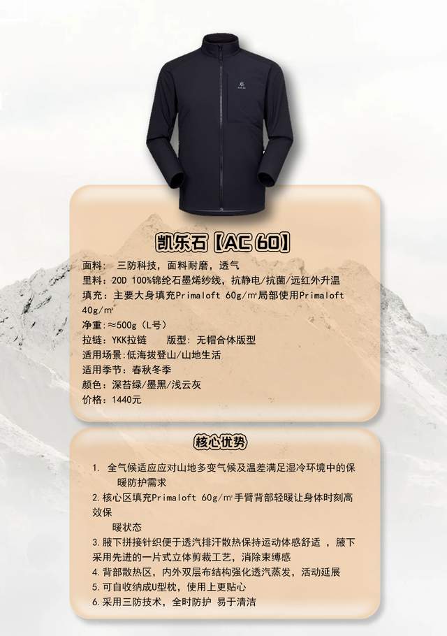 KAILAS凯乐石AC60KAILAS凯乐石AC60是一款专为湿冷天气下轻装徒步和山地生活设计的棉服。主要大身填充60g/m²的Primaloft棉,局部使用40g/m²的Primaloft棉,保暖性能优异,湿水后仍能保持 98% 的保暖性。采用三防科技面料,具备防泼水、防油污、防污性能,易于清洁,同时外层为微弹力耐撕裂面料,耐磨性较好。里料则是20D 100%锦纶石墨烯纱线,具有抗静电、抗菌和远红外升温功能。