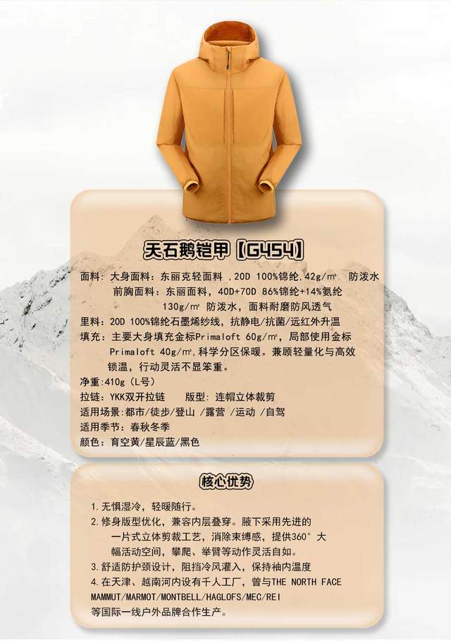 四、重点推荐:天石鹅铠甲G454金标P棉服,秋日全能之选在上述5款棉服中,天石鹅铠甲G454金标P棉服是最适合秋季的 “全能款”,无论日常通勤还是户外登山都能胜任,具体优势可通过下表清晰看出: