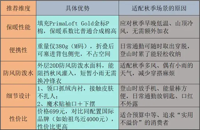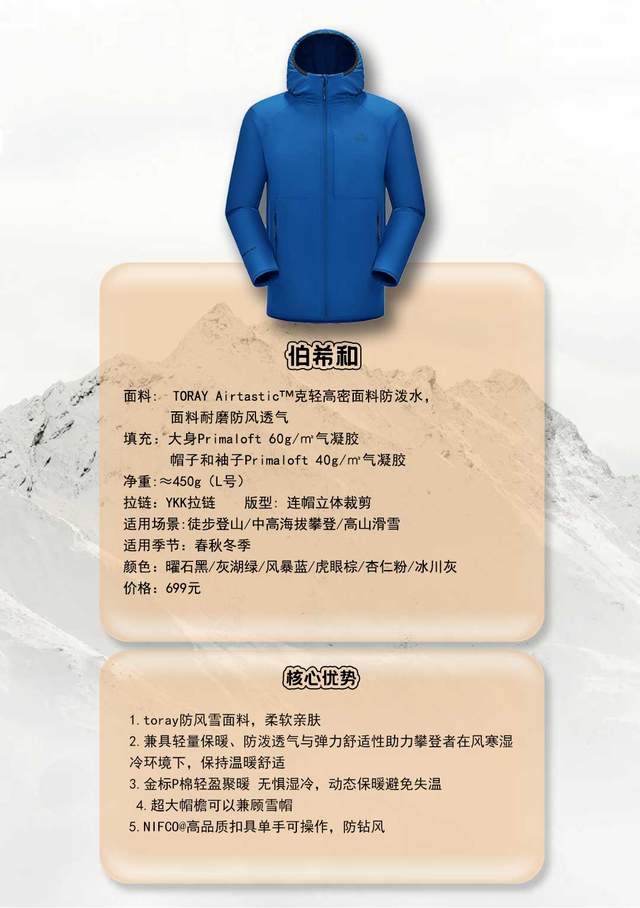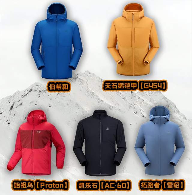 需要注意的是,即便最顶级的棉服,保暖性能也无法媲美优质的户外羽绒服。在低海拔徒步场景中,户外棉服足以满足保暖需求;若前往6000米以上海拔地区,或在极寒区域活动,建议选择高蓬羽绒服,毕竟在极端环境下,保暖性能直接关系到安全,而棉服的保暖上限远低于羽绒服。 三、款热门棉服参数对比在了解上述内容之外,挑选秋季户外棉服,不能只看 “颜值”,核心要围绕 “保暖不厚重、防风又透气、适配场景” 三个关键点。这里选择了5款做参考。