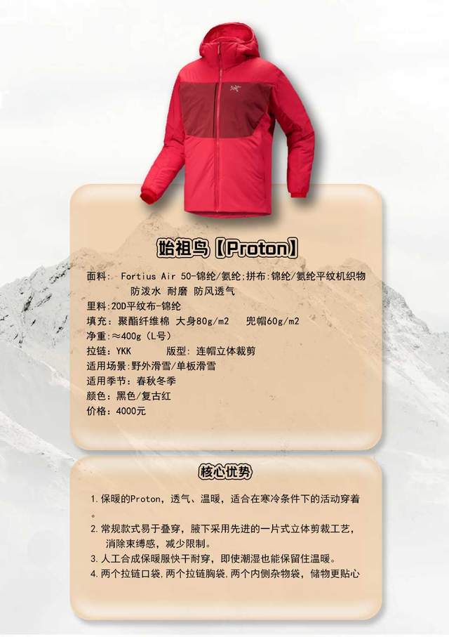 始祖鸟Proton始祖鸟Proton是一系列专为户外运动设计的保暖棉服,性能嘛在我看来并不比上述好太多,价格却高很多,关键是品牌的因数。具体而言Proton系列有多种款式,不同款式填充材质略有不同。如Proton Insulated Hoody采用80g/m²的Primaloft® Gold Active Vent insulation,保暖性能优异,且即使在潮湿环境下也能保持较好的保暖效果,还具有良好的透气性。Proton Lightweight Hoody则采用Octa® Loft针织保暖材料,能**保暖效果的同时,允许空气流通,调节体温。