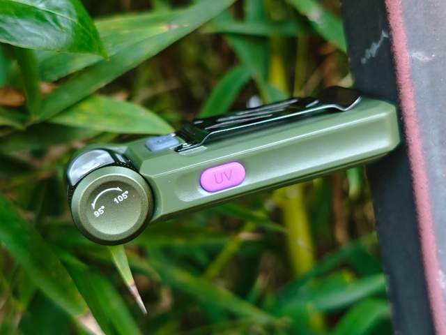 三、核心亮点:200 度旋转灯头与磁吸尾部SW05R 最让我惊艳的当属其 200 度旋转灯头设计,这一功能完美适配了多种工作场景的照明需求。(同步说明,紫色的UV标识按键是紫光操作按键,手电双按键设计让操作逻辑更为清晰。)