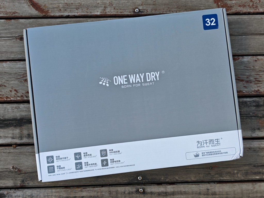 快递盒延续了品牌一贯的简约风格,硬挺的纸盒表面印着低调的 "ONE WAY DRY"logo,角落贴着产品功能标签,清晰标注着单向速干、物理遮热等核心卖点。
