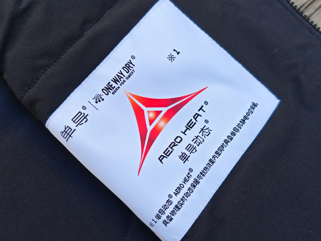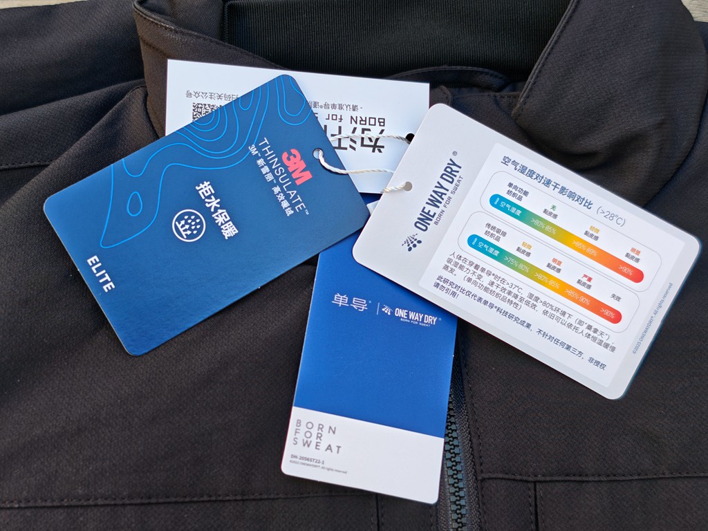 顺带展示吊牌。再次说明单导动态保暖技术采用物理双层双面抗静电通过特殊的制造方式,具备了实时动态的保暖和散热效果。在内外温差的作用下,快速排出多余热湿气,从而达到暖而不闷的效果。