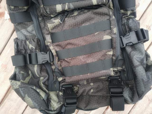 双侧位置有大容量的侧兜,一样配置了MOLLE系统,可结合不同物件做收紧处理。底部有出水口,雨水,水杯放置再次即便漏水也能自然低落干燥。