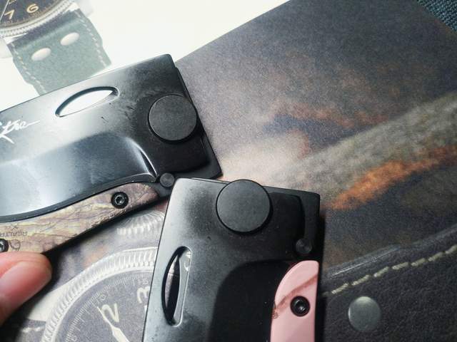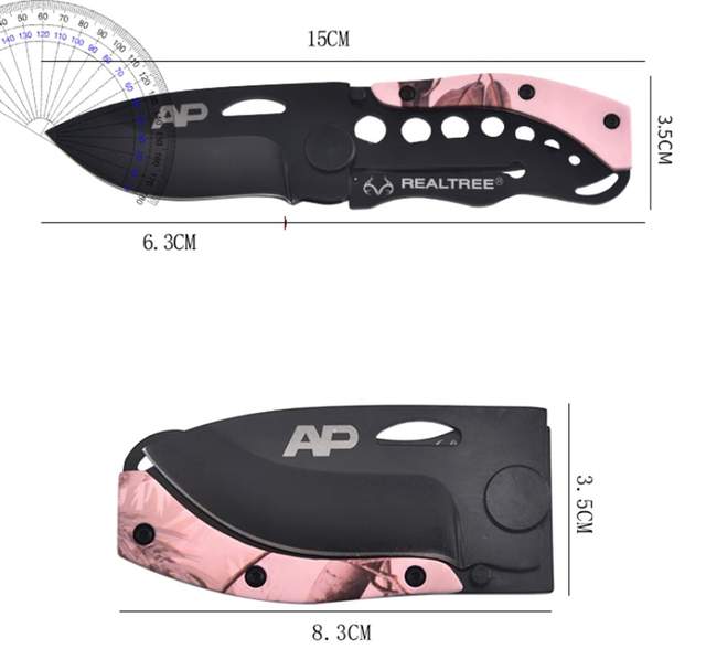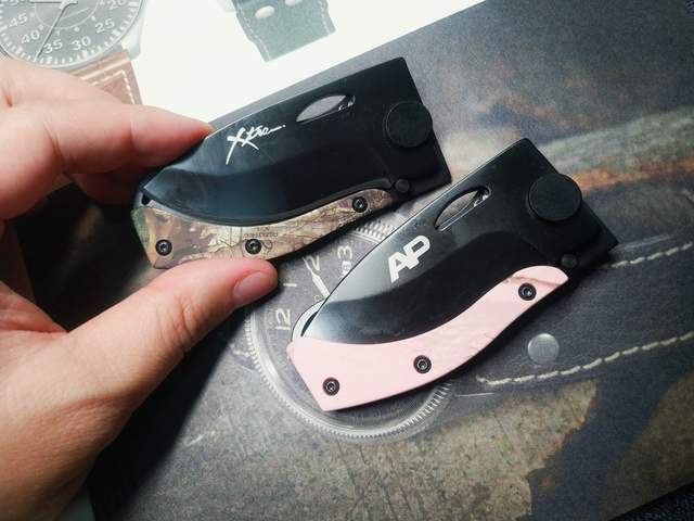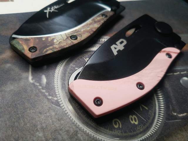 外形两个配色,粉色和迷彩。配色的区分设置在手柄上。手柄的材质为钢片搭配塑料材质,以人体工程学做了握持槽位,手持还是很舒适的。 这里需要说明在选购的时候,刀身的花纹(配色)是随机发货的。如有什么要求需提前向店铺客服说明。