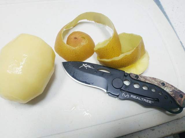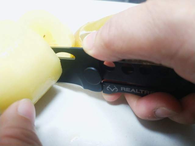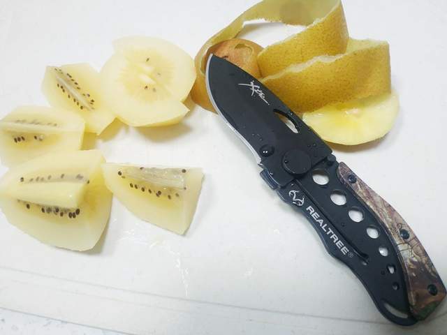 在完成去皮之后,就是切块分食了。这时候也可感受到非常轻松高效的效果。当然,这和果肉相对较软也有关系。其实在户外的时候也可以做割绳等操作。
