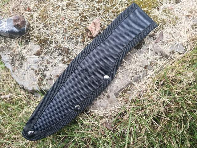 尼龙套对应的刃口位置和尖部位置打铆钉加固。避免刀具刃口切割而使得刀套破损。刀套的最外侧边缘还有包边处理。