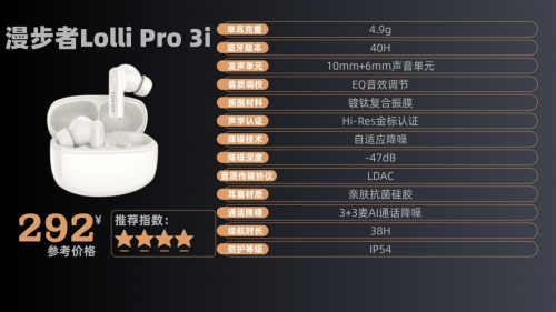 2、漫 步者 Lo l li Pr o 3i 售价:292¥ 500元以内降噪耳机哪款好?这款耳机关闭降噪后单次续航达 9.5 小时,按每天使用 3 小时计算,一周充一次电即可,搭配充电盒总续航 38 小时,短途出差无需携带充电器。充电效率也不错,15 分钟快充能补充 2 小时续航,应急时很实用,不过完全充满耳机需要 1 小时,充电盒则需 1.5 小时,且不支持无线充电。蓝牙 6.0 带来稳定连接体验,10 米内隔墙使用不易断连,双设备切换延迟低至 1 秒内,游戏模式下延迟更是低至 0.06 秒,音画同步表现出色。但充电盒没有电量指示灯,剩余电量需通过 APP 查看,偶尔忘记连接 APP 就会担心突然断电。