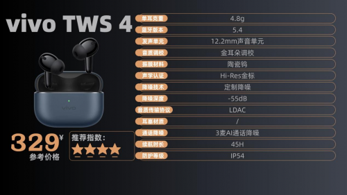 3、v ivo T WS 4 售价:329¥ 500元以内降噪耳机哪款好?其采用的 aptX Adaptive 和 LDAC 双高清音频编解码,让音乐传输更高效,听摇滚乐时,鼓点强劲有力,吉他失真音效还原度高,不过在开启 HiFi 模式后,偶尔会有轻微底噪。降噪上,三麦克风降噪系统加上 AI 算法,能精准识别环境噪音,在办公室可屏蔽键盘声,但在嘈杂的商场,对各种混合噪音的降噪效果不太稳定。耳机佩戴舒适,单耳仅 4.8g,长时间佩戴耳朵也不累。外观上,深海蓝配色很有质感,充电盒设计简洁。续航给力,关闭降噪单次能用 11 小时,能满足长时间外出使用,就是充电接口非通用设计,出门得多带根线。