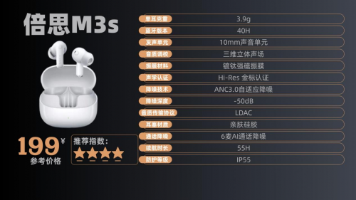 4、倍 思M 3s 售价:199¥ 500元以内降噪耳机哪款好?这款耳机采用蓝牙6.0技术,10mm单元配合BISA空间音效,影院模式声场开阔,音乐模式人声细腻,但中高频通透度稍弱。降噪深度-50dB,通勤时地铁轰鸣声削弱显著,办公室键盘声可屏蔽90%,高频噪音如婴儿啼哭降噪效果一般。单次续航12小时,快充10分钟续3.5小时,满足长途需求。耳机重量4.3g,大耳廓用户长时间使用易酸痛,充电盒LED电量显示直观,但塑料感较强,缺乏无线充电功能。光合绿配色清新,综合性能在百元价位竞争力突出,适合预算有限且追求均衡体验的用户。