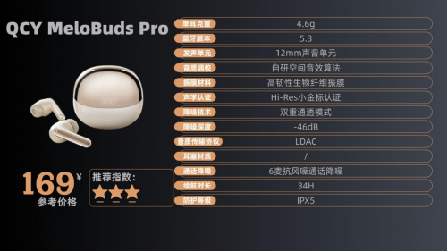 5、Q CY Me loB uds P ro 售价:169¥ 500元以内降噪耳机哪款好?通过 QCY App 可对 MeloBuds Pro 进行丰富设置,降噪模式除自适应外,还能手动切换至抗风噪、嘈杂等模式,其中抗风噪模式专为户外设计,而嘈杂模式在 KTV 隔壁房间能隔绝 70% 歌声。通透模式支持 6 级调节,开到 4 级就能清晰听到环境音,开启人声增强功能后,与人交流无需摘耳机,声音自然不生硬。App 内的空间音效功能很适合观影,开启后声场变得空旷,声音定位准确,只是启用该功能后 LDAC 编码会自动失效。耳机触控区在耳柄外侧,支持自定义单击、双击等操作,设置为双击切歌很方便,只是戴厚手套时操作灵敏度会下降。充电盒充满需 1 小时,只是没有电量指示灯,剩余电量只能通过 App 查看,偶尔忘记连接就没法判断电量。