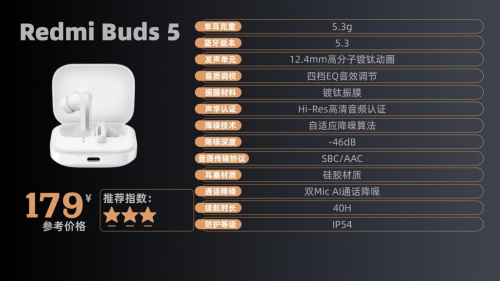 6、Re dm i Bu ds 5 售价:179¥ 500元以内降噪耳机哪款好?这款耳机单耳 5.3g 的重量搭配三对硅胶耳塞,多数人连续佩戴 3 小时耳道也不会有明显压迫感,日常通勤走路时佩戴稳固,只是小耳道用户可能需要换成小号耳塞才能避免松动。它的 46dB 降噪深度能有效压制地铁低频轰鸣声,深度、均衡、轻度三种模式可按需切换,办公室用轻度模式过滤键盘声很实用,不过面对高频的尖锐交谈声,过滤效果稍弱仍会听到零星声响。IP54 防水等级应对雨天或出汗没问题,关闭降噪后单次续航 10 小时,总续航 40 小时足够一周使用,只是 10 分钟快充 4 小时的功能,偶尔会因充电接触不良需要重新插拔。