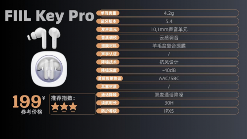 7、F IIL Ke y P ro 售价:199¥ 500元以内降噪耳机哪款好?耳机搭载10.1mm定制羊毛盆复合振膜,支持蓝牙5.4与AAC/SBC编解码,音质温暖但高频延伸稍显克制。其入耳/半入耳双形态设计通过可替换耳帽实现,入耳模式下40dB双馈降噪有效削弱地铁低频噪音,然而半入耳模式仅依赖被动降噪,对中高频突发噪音(如婴儿啼哭)降噪效果有限。此外,ANC OFF时约6.5小时续航,充电盒额外**4次充电,总续航约30小时,满足日常需求。尽管IPX5防水防汗适合运动场景,但充电盒稍显厚重,需注意携带便利性,整体性能在同价位中表现均衡,适合多场景适配,部分用户反馈耳塞尺寸选择需更丰富。