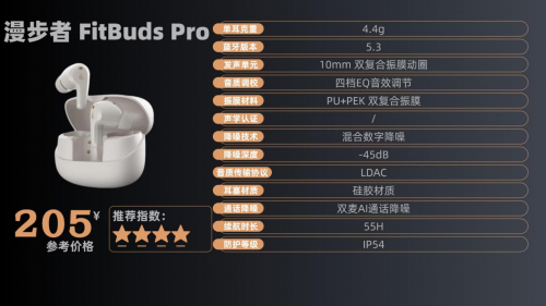 8、漫 步者Fi tB uds P ro 售价:205¥ 500元以内降噪耳机哪款好?这款耳机单耳重量为 4.4g,搭配三种尺寸的硅胶耳塞,多数人佩戴时能保持较好的贴合度,连续戴 4 小时也不会让耳朵产生明显酸痛感,只是小耳道人群若选择默认中号耳塞,可能会有轻微松动。45dB 混合数字降噪对低频噪音的过滤效果较明显,能有效压制常见的环境低频嗡鸣,不过面对高频尖锐声音时,过滤能力会弱一些,仍能听到部分杂音。其搭载的 10mm PU+PEK 双复合振膜单元,播放音乐时低频表现适中不轰头,中频人声还原清晰,高频部分在大音量下偶尔会有轻微刺耳感。15 分钟快充可补充 1.5 小时续航,关闭降噪时单次续航达 5.5 小时,总续航 30 小时,满足日常使用需求,只是充电盒不支持无线充电,只能通过有线方式补电。