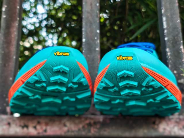 从侧面看,鞋型呈现前低后高的坡度,符合越野跑的运动力学需求;
