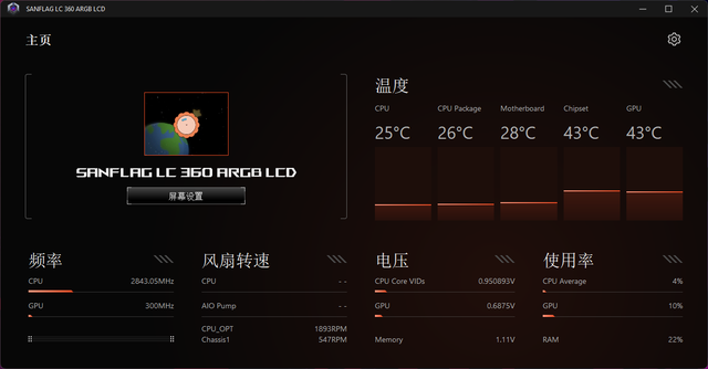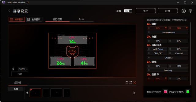 圣旗圣狮360水冷也有专用软件设置屏幕显示内容,只是目前素材有点单调,但基本显示的信息还是有的,希望后期素材能够丰富一些,让水冷界面更酷炫更好玩。