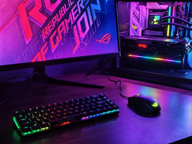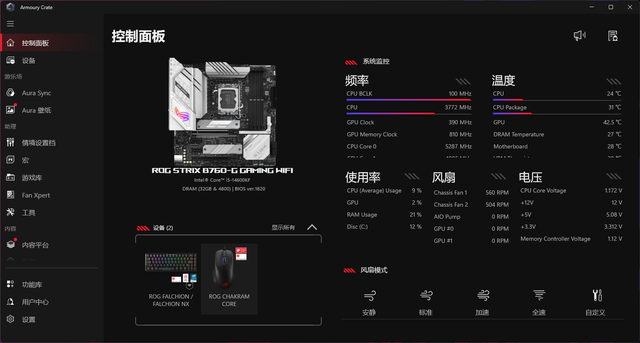 开机后,TUF TR120 ARGB风扇和圣旗圣狮360水冷的冷头同时亮起,ROG B760-G GAMING WIFI主板和ROG魔导士键盘、ROG魔刃鼠标也能够通过华硕主板的Armoury Crate软件进行神光同步,支持多种光效模式切换,包括呼吸、循环、静态等,颜色过渡自然,光效柔和不刺眼。