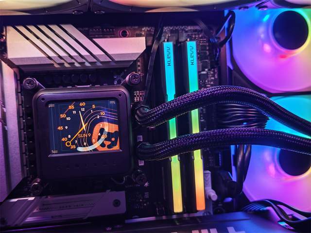 圣旗圣狮360 ARGB水冷是这次装机的“散热核心”,黑色冷排搭配ARGB冷头,冷头中央的显示屏支持软件自定义显示,风扇支持神光同步,与TUF风扇的光效呼应,视觉统一性拉满。冷排采用全铝材质,内部水道密集,散热面积达120×300mm,配合三把120mm高风压风扇,散热能力强劲。