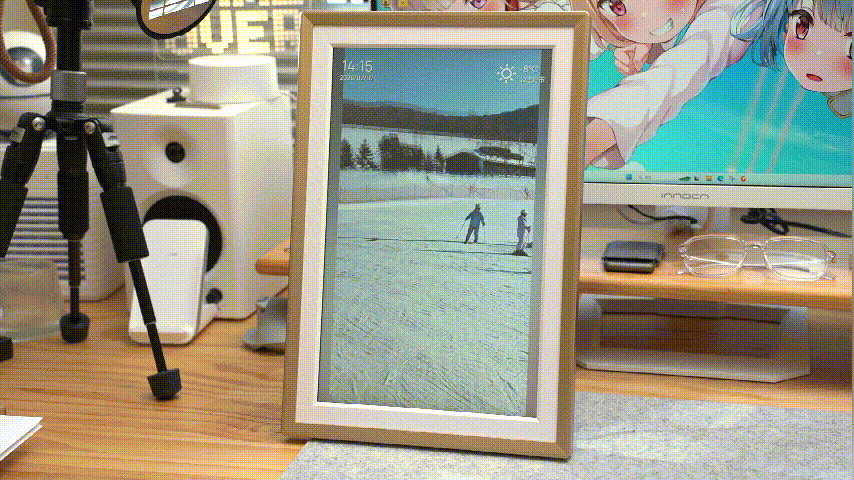 而在更深层面的屏幕参数来看,可以看出老牌屏幕厂商的功底,300 cd/m²的亮度、1000:1的对比度可以在高光环境下也能做到清晰的显示,比如说在我的书房中我开了神牛摄影灯以及氛围补光灯的基础上,它依旧保证了清晰的画质。 细心的小伙伴会发现我所插入的照片有横向也和有纵向,这些其实不需要进行设置,它内置了重力传感器根据摆放的方式和照片进行自动切换,免去了