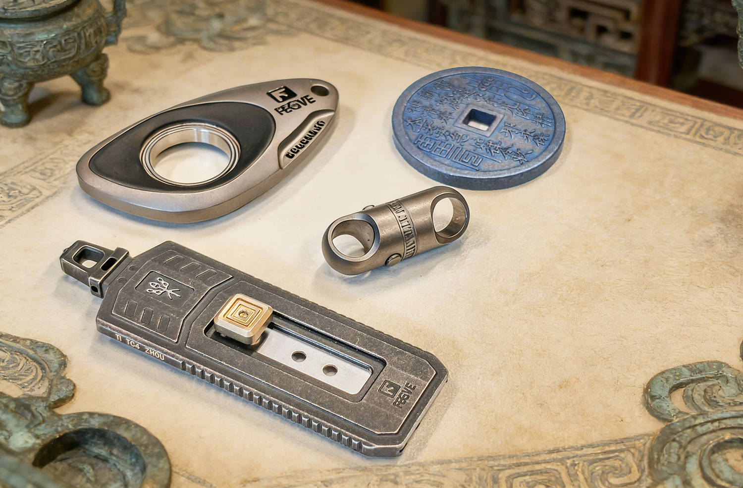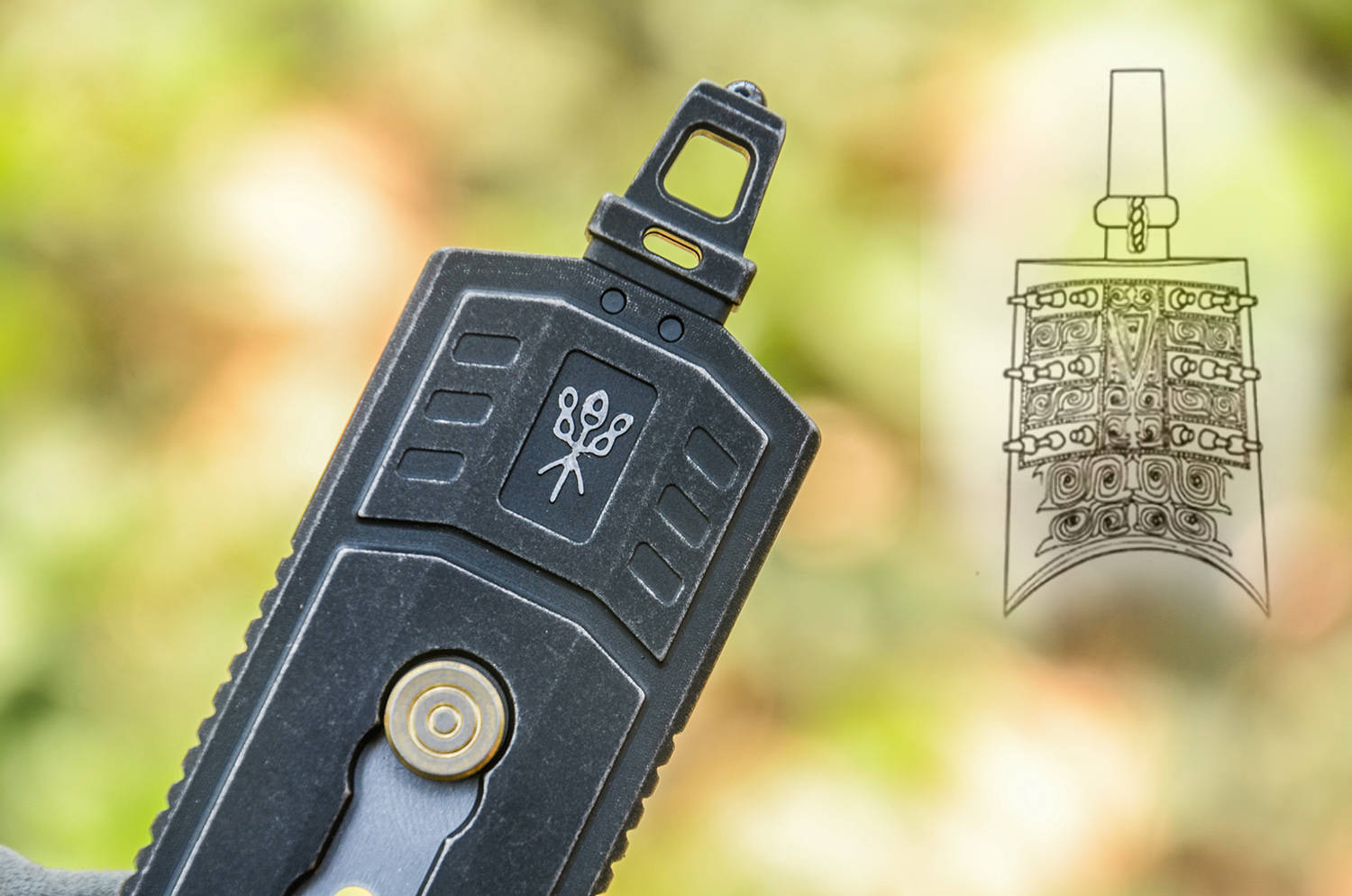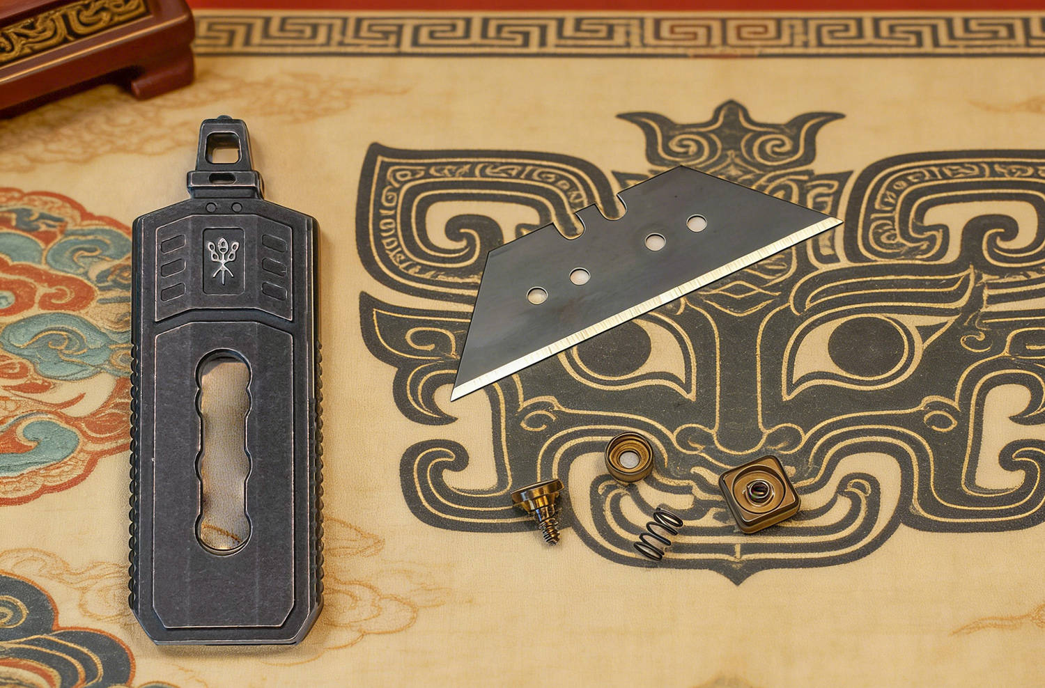夏启立国,开华夏王朝之始,奠下文明根基;商继其后,文字成熟、甲骨铸史,神权与王权相融;周承商制而革新,制礼作乐、分封天下,确立宗法秩序;三代递嬗,共铸中华文明之初基;周化神权为人伦,融征伐于礼乐,使天下归心、诸侯有序,开华夏礼仪之先河。 FEGVE费戈“夏”裁纸刀,取周礼之魂,铸现代之器,一器在手,如执周室礼器,于文房案头间,裁尽纸墨纷扰,复见礼乐风雅,此非寻常工具,乃以器载道、以刃承礼的华夏文心。 以钟铸礼,以琴治乐费戈“周”最大的特色就是象形,以周制礼乐而承百代之统,启千秋之业,定华夏衣冠之序,立万古文明之基,周裁纸刀以编钟为形制,融钟鸣鼎重之韵,合礼乐法度之规,方寸之间尽显宗周之雅度与文房之风骨。 周的外形还借鉴了古琴的三转面,线条婉转有度,弧面温润流畅,既承古器雅韵,又合握持之姿,一器融编钟之礼、古琴之韵,于刚劲中见温婉,尽显周礼文质彬彬之美,古乐齐鸣、为你钟琴。 费戈周的长宽厚分别为78×29×4mm,全出状态长度98mm,小巧合礼、盈握相宜,薄如圭璧、宽合分寸,收则便携藏锋,出则利落裁纸,方寸间尽得周礼中正雅致之韵。 周的编钟之顶留有挂孔,形制古雅精巧,既取礼器悬鸣之姿,亦合日常随身之用,穿绳系扣可作挂饰,携行稳妥不占空间,于细微处见匠心,尽显周礼器用兼备的实用与风雅。 其下,还有一个通孔,可以对穿过1.5×6标准氚管,微光内敛不张扬,暗合周礼 “温润而泽” 之韵,日间隐于器身,入夜微芒自现,兼具装饰之美与实用巧思,细节之处尽显匠心。 良材铸器,巧构藏锋周的框架为TC4钛合金打造,CNC工艺切割打磨而成,质地轻盈坚韧,耐腐蚀不易变形,手感温润不冰手,整体线条利落规整,棱角处婉转有度,既保留金属质感,又暗合周礼中正平和之韵,尽显精工之美。 表面镀黑、石洗做旧,色泽沉敛如古鼎,质感厚重似宗周礼器,耐磨抗刮不留指纹,哑光肌理温润内敛,不耀锋芒却自带威仪,恰合周礼藏锋守拙之气度,愈用愈显包浆韵味。 钛合金具有高强度、轻量化、无磁性、亲生物等特性,周的净重约为28.8克,拿在手上轻若无物,一体式框架结构,保证了足够的强度,整体无冗余拼接,刚性十足握持扎实安心,兼具耐用性与手感,尽显周器严谨规整之礼序。 于周鼎之顶,还镶嵌一枚高硬度陶瓷珠,质地坚硬耐磨,应急之时可破窗求生,兼具文房雅玩与实用防护双重之用,刚柔并济,藏锋芒于礼器之中,尽显周文化外雅内刚的气度。 6mm厚度的钢化玻璃,只需轻轻一敲,即分崩离析,,陶瓷珠珠锋芒内敛,却能一击即破,应急自保从容不迫,文可裁纸案头,武能临危破险,一器兼具雅玩与防护,尽显周礼刚柔相济、动静相宜之道。 再看周的本体以及陶瓷珠,均毫发无损,足见材质之坚与工艺之精,携带安全、坚硬稳固、历击不损,既承周器厚重之质,又兼顾实用可靠,应急之余亦无损文房雅器之姿。 开合有度,裁切循法作为一款裁纸之器,周为推动式设计,收则和谐万邦,出则锋芒毕露,通过推扭带动推孔来实现出和收,方形推扭为“回”纹设计,兼具美观与防滑,金色表面彰显周之繁盛。 推扭为手拧对锁螺丝,其间还有垫片固定,以及弹簧蓄力,,结构紧实稳固,开合顺滑有度,回弹干脆利落,细节处尽显严谨工法,暗合周礼规整有序之韵。 周使用的是世达93434A四孔裁切片,标准制式,方便替换,通用性强无需特意定制,长久使用也能随时焕新,刃口锋利稳定,裁切干脆利落,兼顾日常实用性与长久耐用性,尽显以人为本的周制匠心。 周共有4个档位,档位清晰、定位牢靠,进退有度,暗合周礼节制有度、动静有序之精髓,一档完全收起,安全无伤,二档仅出约1.5mm,开箱一划即过,外开包装,内无损伤,合乎实用之道。 三挡为半开,出约11mm,适合精细切削,刃长适中、控刀稳定,既能保证锋利效率,又不易过伸误伤,尽显周制有度、分寸得当的礼乐之美。 四挡为全开,20mm,刃身尽展、出锋规整、切割顺畅,裁切厚纸、卡纸、塑封膜皆从容利落,力道足而不躁,一如周礼张弛有道,尽显刚柔相济的器物智慧。 执周工一柄,承礼乐千年,藏锋守拙,裁纸成章,刚柔兼备,雅器天成。