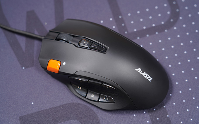 黑爵AJ337宏游戏鼠标采用了右手人体工程学设计,多达12颗按键在第一时间就给人留下深刻印象,与其他侧键很多的鼠标不同,这款鼠标在配色上比较保守,没有刻意突出侧键,而是在整体纯黑配色加上一点橙色点缀,低调典雅不呆板。它的外壳采用UV涂层,呈现哑光质感,侧键和DPI按键大多设计为镜面材质,对比效果多了很多层次感。这款鼠标上手第一时间给人的印象是比较有质感的,做工精细,设计也比较有水平,完全没有一般入门鼠标粗糙简陋的感觉,感觉更像是定位中端的游戏鼠标。