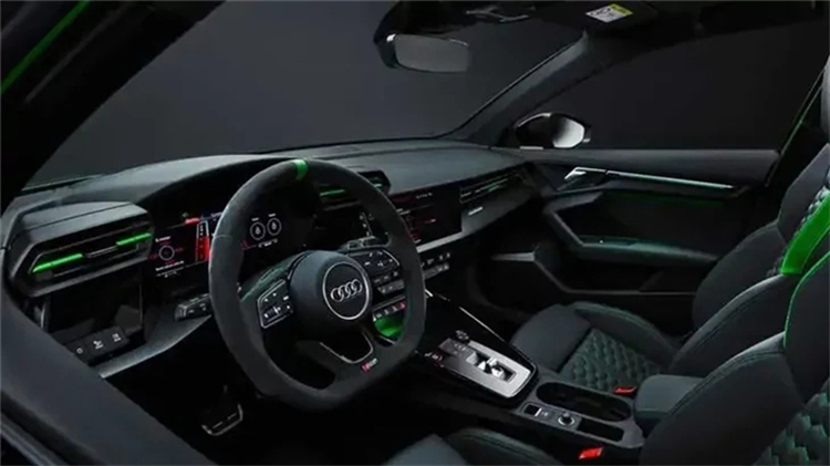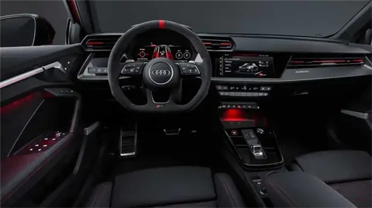 内饰方面整体沿用了全新一代A3的造型,标配了12.3英寸全液晶仪表盘,而且支持显示转速,车辆G值、动力输出和扭矩输出等信息。挡把也是拨杆式换挡机构,搭配贯穿式的空调出风口带来了比较强的档次感。内饰用料也对得起身份,标配了RS运动风格座椅,而且使用了碳纤维材质或者说Nappa皮革进行包裹,而且还有和车身同色的缝线工艺进行点缀。