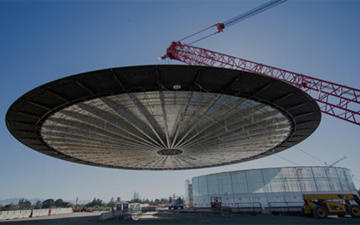 图中展示了施工方吊顶的过程,屋顶采用的是碳纤维材质,同时还融合了钢铝。苹果表示,屋顶是在迪拜设计和组装完成然后运回美国,重达80吨,直径45米左右,是同类建筑模块中最大的。