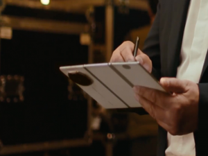 预热视频里,老余在类似演播厅后台的场景里,左手拿着新款白色三折叠,右手拿着一支手写笔在屏幕上点点画画。随后,一名工作人员上前告知老余该上场了,于是老余转身走去,并将手机折叠起来,放在西装上衣的内口袋里。结尾则是发布会的定档日期。