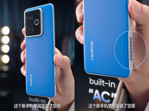 在真我发布的这个尴尬小剧场里,徐起展示了一款背部为蓝色的手机,在手机的左侧下方边框设计了一串“智智智己己己”logo样式的散热孔,号称“在里面装了空调”。然后展示了用“空调”吹水里的小黄鸭、吹蜡烛和吹小猫屁股的毛,风力看起来倒是蛮强的。