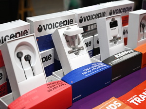 据公司CEO周超介绍,AI模块内嵌kikaGO自研的AI音频芯片,可以插入现在所有主流的智能手机和电脑的USB口,并且同时与任意一款蓝牙设备进行配对,比如蓝牙耳机、无线麦克风、蓝牙眼镜、蓝牙音箱,将它们“无痛升级”成具有双向通话同声传译能力的AI设备。现场也展示了应用AI模块的voicepie有线耳机、蓝牙耳机、无线麦克风,以及话务耳机、无线会议扬声器等多类产品。