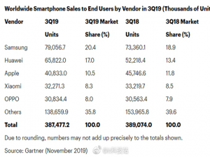 目前知名的统计机构Gartner公布了最新的2019年的智能手机销量榜,和厂商喜欢公布的出货量不同的是,这里的手机指的是最终到达用户手机的产品有多少,和出货量相比更加符合实际的市场占比。由于世界手机市场已经处于饱和的阶段,因此2019年第三季度智能机销量3.87亿台,同比下滑0.4%。