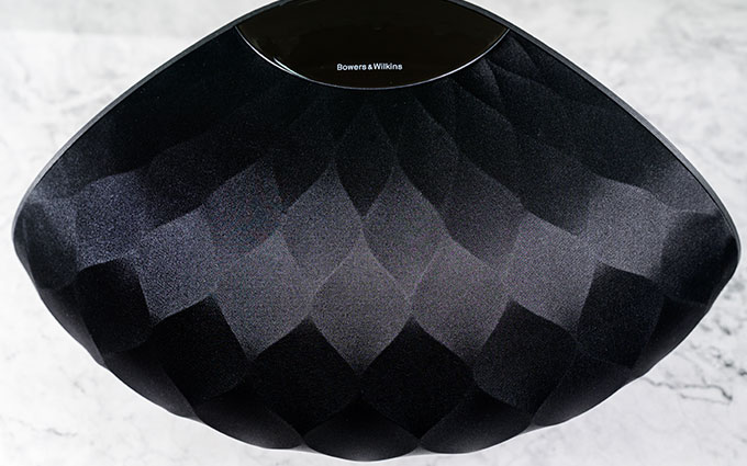 Formation Wedge一反人们对音响造型的认知,从正面看是一个椭圆形,俯视时犹如一片贝壳,呈一个扇状,表面覆盖的黑色织物网罩以片片菱形交织在一起,婉如贝壳表面延申的纹路,机器顶部是纯黑色玻璃面板,当中隐藏了触摸按键,背面是一个结实木制外壳。除了文中黑色版Formation Wedge,B&W还推出了银色款供消费者选择。