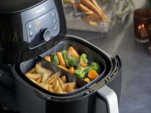 飞利浦HD9621/91空气炸锅采用了新一代Turbostar高速空气循环技术,热量从炸锅最顶部发散,并加速,在锅内形成强大的空气对流,确保烹饪的食物外部能迅速形成金黄酥脆的煎炸效果,而水汽却被智能地即时排出,使食物内部鲜嫩多汁,从而带来鲜香松脆的绝妙口感。底座设计也独具匠心,配合顶部发热装置相得益彰,使热量更为均匀地发散到锅内每个角落,真正达到日常传统煎炸食物的美味效果。