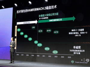 在会上,希捷也透露,在采用HMR热辅助技术后,未来的企业硬盘的方向将根据需求分成两大块,一方面是在更大容量基础下,利用MACH.2多磁臂技术,满足更高速率的需求,并且随着容量增加,速度也会相应增加,满足高存储用户对容量的需求。而另一个方向是继续保持单磁臂,为非性能敏感型应用,提高存储容量。