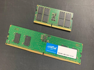 桌面版UDIMM和笔记本版SO-DIMM两种内存条二者除了大小、接口不同,其他基本规格完全一致,均采用英睿达自家美光研发的DDR5颗粒,其中桌面版单条容量8GB,而笔记本版为32GB,频率4800MHz、时序CL40、电压1.1V。