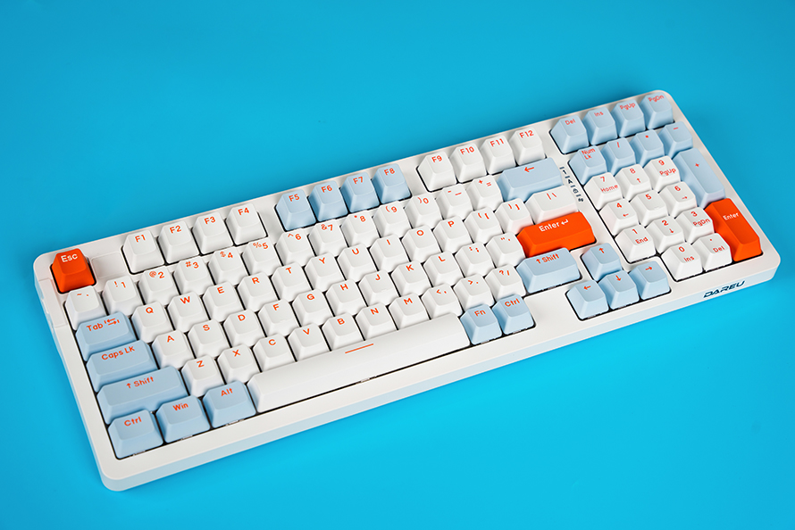 此外,达尔优A98有线机械键盘提供了可换键帽的配件,如若觉得橙色键帽有些碍眼的话,可以更换为蓝白配色为主体的样式,要是感觉橙色键帽太少了,也能换上更多的红色键帽。