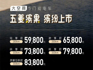昨晚,五菱缤果正式上市,此次新车共推出5款车型,起售价5.98万元。新车定位纯电小型车型,但提供了出色的内部空间,根据不同配置,提供203km和333km两种续航。