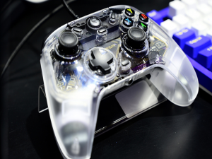 在盖世小鸡的展区,最吸引人的莫过于这款T4幻境多平台手柄。在外观方面,盖世小鸡T4幻境是采用了波点全透面壳,而手柄里的电路板则是清晰可见,透露着十足的科技感。当然,手柄上还有1680万可编程幻彩灯效,也为手柄的外观增光添彩了。