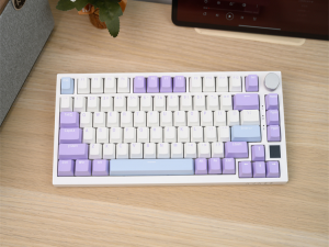 我手里的这款就是雾川海配色,搭载40g触发的海盐轴,键帽是PBT三拼色,低饱和的薰衣草色系配合海风系蓝白色,一眼望过去顿觉十分清爽,键帽摸起来有明显的磨砂手感。