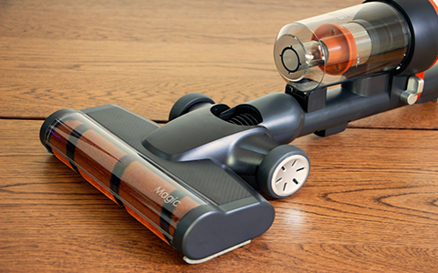 M12采用立式手持组合设计,重心在下方,增加了滚刷与地面的贴合度,配合机身下部的滚轮设计,只需轻轻一推,即可轻松搞定地面清洁。地面吸尘时手部几乎无需用力,就能轻松来回推拉,解决了手持吸尘器由于重心高,拿着重的问题,无需弯腰或蹲下。